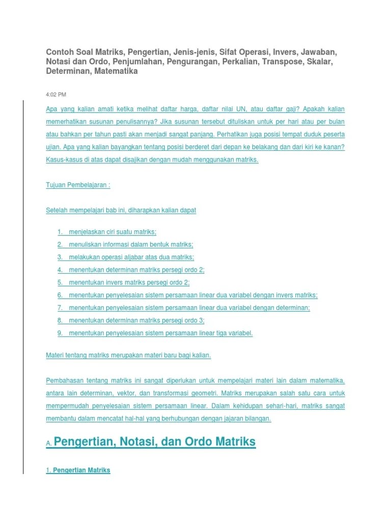 02.07.2021 · di dalamnya terdapat contoh soal yang disertai pemb. Agar lebih jelasnya lagi perhatikan contoh soal di bawah ini : Dua atau lebih matriks dikatakan sama bila mempunyai ordo (jumlah baris dan kolom) sama dan komponen yang sama di setiap selnya. Dua atau lebih matriks dikatakan sama bila memiliki ordo (jumlah baris dan kolom) sama dan komponen yang sama di setiap selnya. Postingan ini membahas contoh soal sistem persamaan linear dengan menggunakan matriks dan pembahasannya.